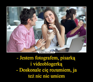 Spotkałam taki oto demotywatorek na Facebooku. Nie byłabym sobą, gdybym na niego nie zareagowała. W końcu sama piszę. Zanim jednak coś pod nim napisałam, zaczęłam czytać komentarze innych osób, które posypały się tam lawinowo. Zdania były podzielone. Część osób wyśmiewała wymienione zawody, twierdząc że teraz każdy pisze, bo nic innego nie umie, a część broniła tych zawodów przypominając, że każdy zawód wymaga określonych umiejętności. Te komentarze to garstka w porównaniu do liczby wszystkich Polaków, ale można stwierdzić, że cały naród dzieli się na takie dwie grupy, z tym że niestety ta pierwsza grupa jest zdecydowanie większa. Dlatego postanowiłam napisać o tym na blogu.